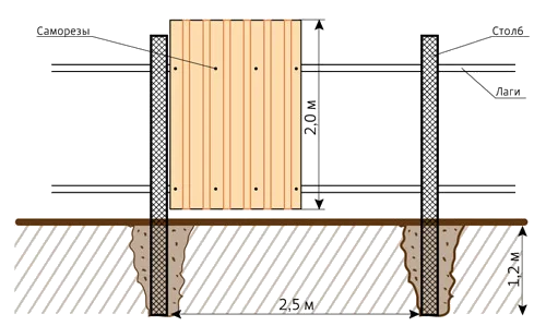 Рекомендуемое расстояние между столбами составляет 2,5м. В зависимости от глубины бетонирования столбов и наличия бетонного основания труба вкапывается в землю на 0,8-1,2 метра.